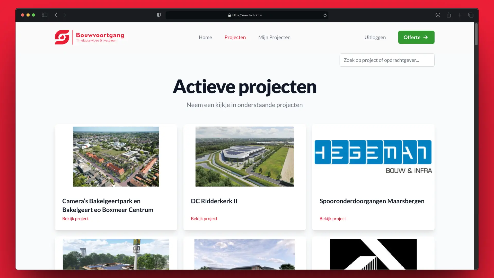 Bouwplaats webcams service voor livestream en timelapse. Maatwerk applicatie, gekoppeld met alle webcams voor het automatisch downloaden van afbeeldingen, en uitgebreide CRM functionaliteiten.