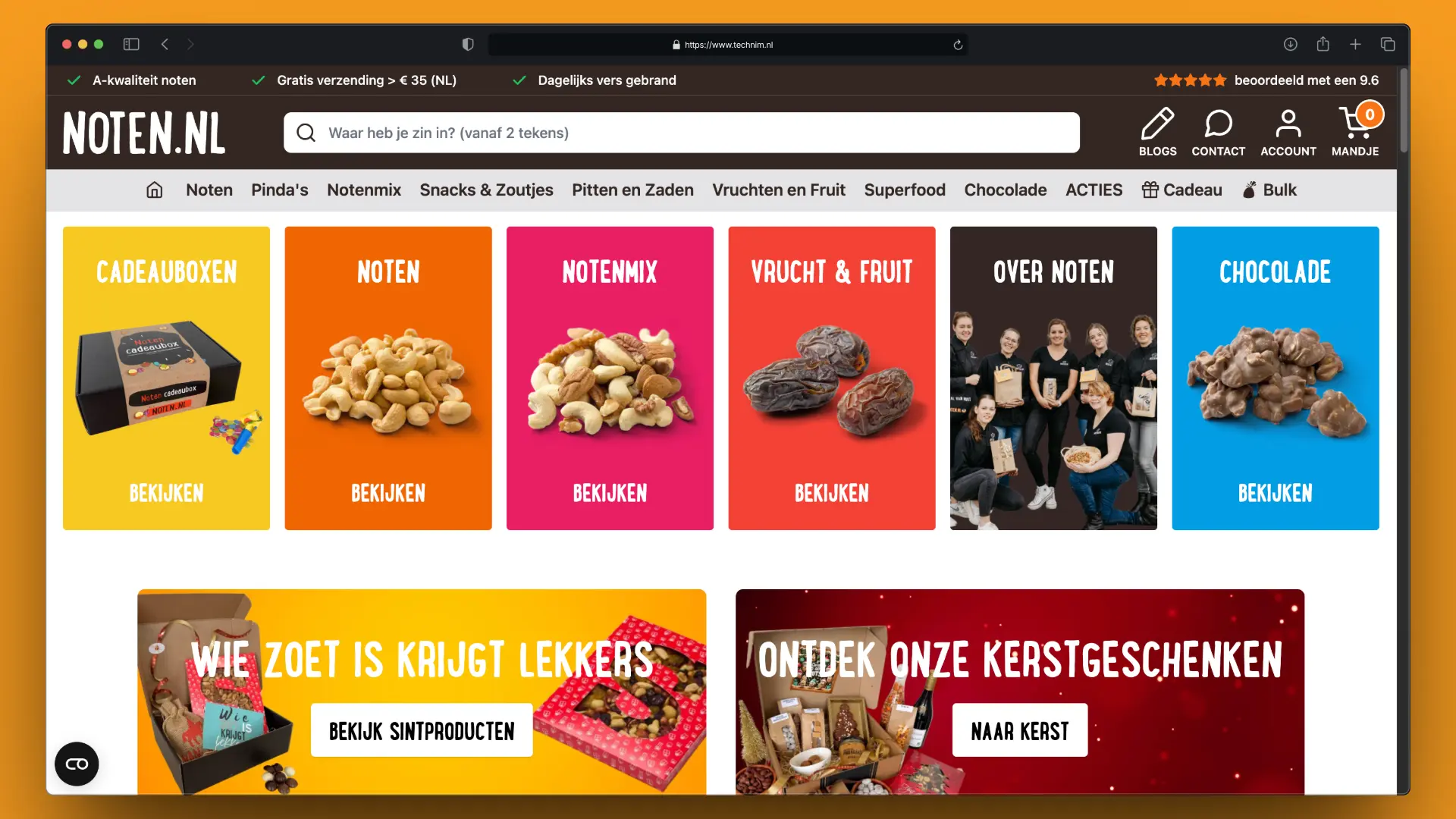 Webshop voor verse noten, heerlijke notenmixen, Belgische chocolade, smaakvolle pinda’s en ongezoet gedroogd fruit. Gekoppeld met Algolia voor razendsnelle zoekresultaten.